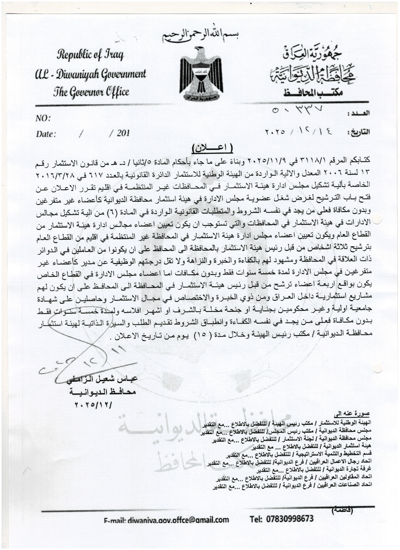 ترشيح عضوية مجلس ادارة هيئة استثمار الديوانية