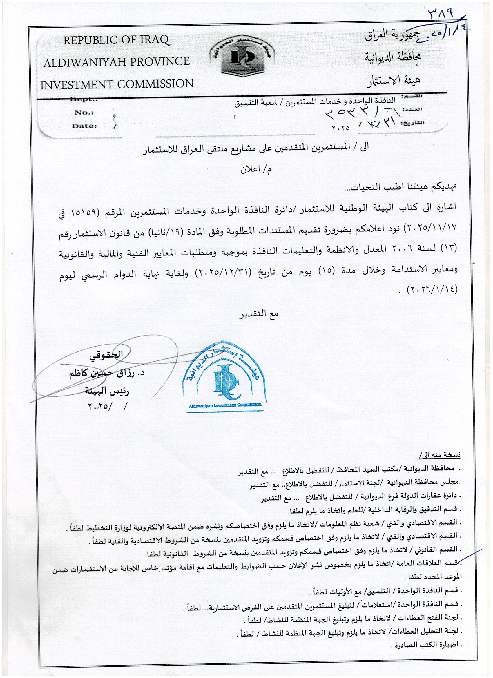 الى المستثمرين المتقدمين على مشاريع ملتقى العراق الاستثماري